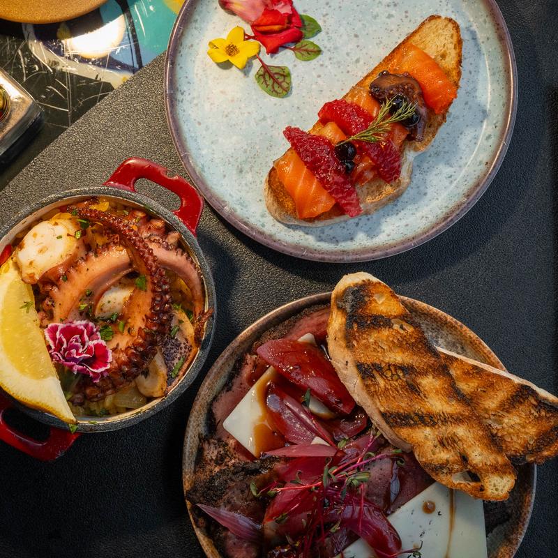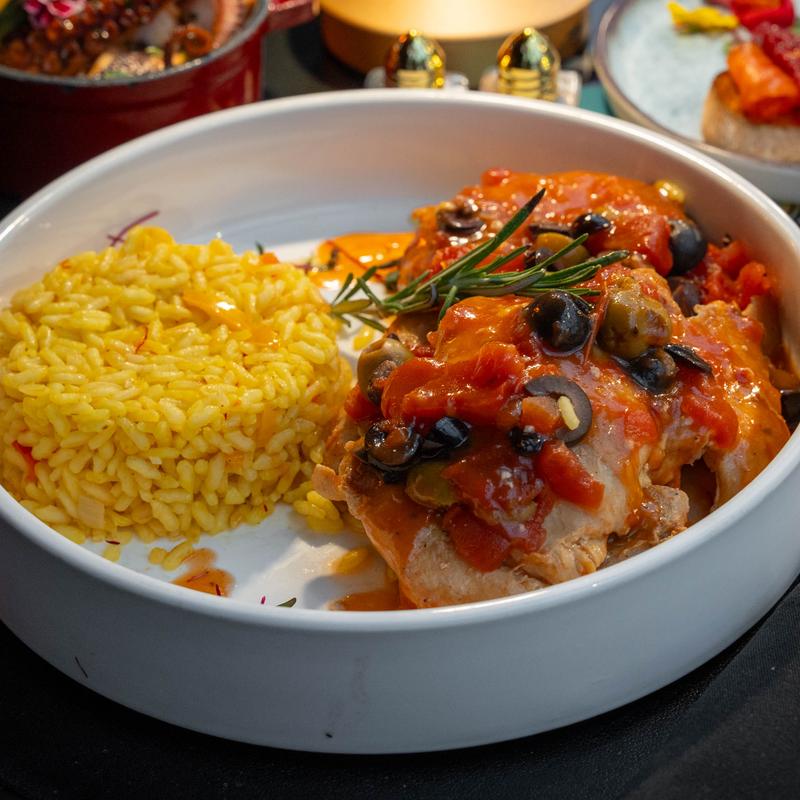 During lunch and dinner service, guests can order favorites like gazpacho, oysters, and paella from the main menu. Where it gets spirited is when the tapas start moving. The Chef’s rotating courses flow from the kitchen on overflowing trays, balanced by enthusiastic Bandoleros - animated servers who invite guests to jump in while the moment lasts.Raise your hand. Laugh and shout. Wave a scarf in the air. Choose wisely and quickly, or the Bandoleros may whisk the tray away! Miss one? No worries - another delicious surprise is always on the way. The fun spreads fast, much like the honeyed butter served with our irresistible cornbread.